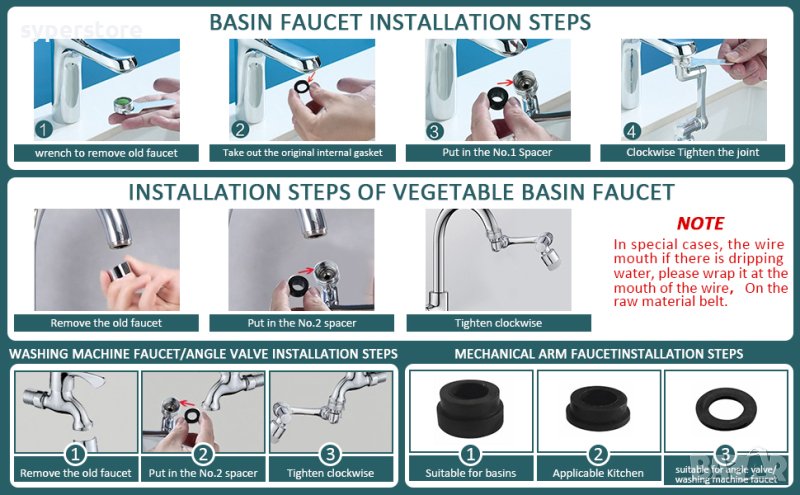 Универсален накрайник осигуряващ 3 размера за свързване: Външна резба G1/2 (20MM) с най-тънката шайба; Външна резба 55/64" (22 MM) с шайби със средна дебелина; Най-дебелата шайба с външна резба 15/16" (24 MM). Може да бъде идеално съвместим с 98% кранове за мивка. Моля, измерете оригиналния диаметър на резбата на крана, преди да поръчате.