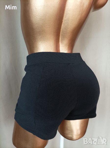 Къси черни панталонки рипс е талията е с ластик отпред с имитация на джоб . Талия 35 до 45 см едностранно,ханш 42 до 52 см едностранно, дължина 26 см широчина на крачола 28 до 34 см едностранно . Няма следи от употреба.