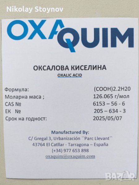 Имам удоволствието да Ви предложа една от най-качествената оксалова киселина на световния пазар, произведена от испанската компания Oxaquim!