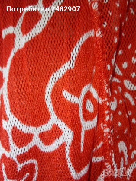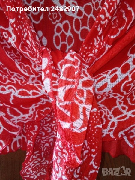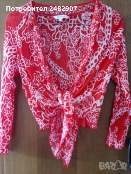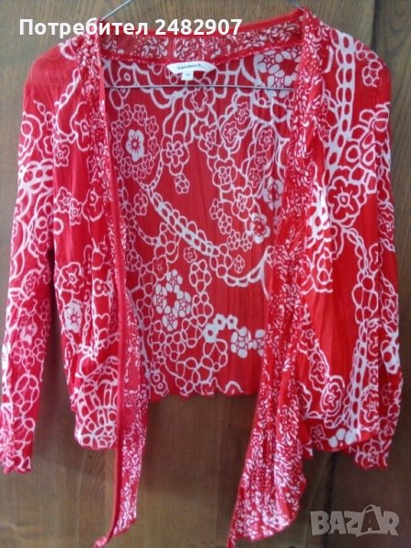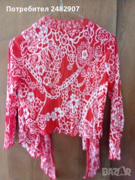 Ново дамско болеро от тюл в червено и бяло, размер М. Съдържа 100 % полиестер, с дълъг ръкав и мачкан ефект. Ширина в раменете - 37 см, ширина под мишниците - 48 см, дължина от рамото до долу - 49 см, дължина на ръкава от рамото - 47 см. Много ефектно, полупрозрачно.