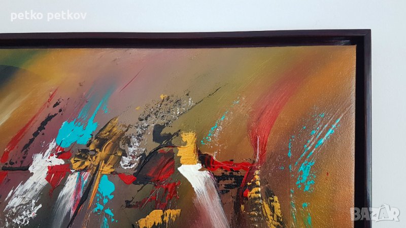 Акрил върху платно на подрамка. Рамката е от т. нар."плаващи рамки", все още малко познати в България. При тях картината е пред рамката, докато при конвенционалните - отзад. Тя също е собствено производство и е уникат. Цвят на рамката - махагон. Размери с рамката 77/44 см