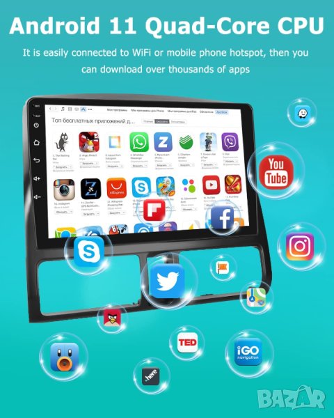 Wi-Fi интернет, новият Андроид, Bluetooth за разговори и музика, USB входове за флашка и зареждане на устройства, GPS навигация, теми за вид на меню, еквалайзер за настройка на звука, бърза реална RAM памет от ново поколение. ТОП дизайн!