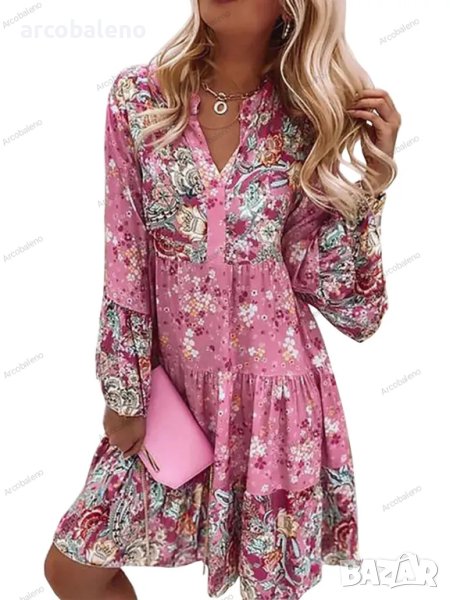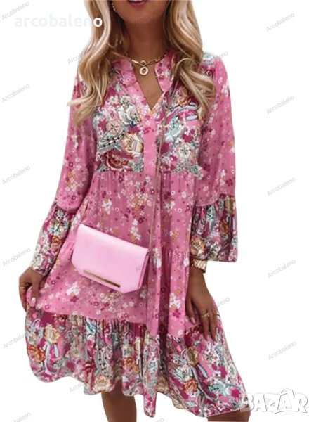 Дамска мини рокля с V-образно деколте и щампована флорална мозайка с дълги ръкави, 3цвята