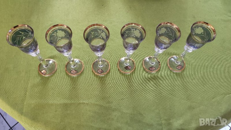Стар сервиз 6 чаши Арт Бохемия цветно стъкло, позлатени за ликьор. Сервизът е нов, не използван,ръчно произведен, гравиран и рисуван, Чехия. Отлично състояние, няма забележки.