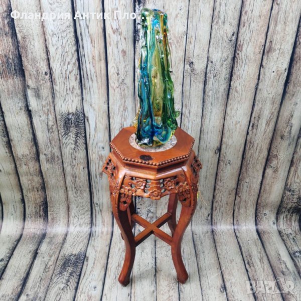 Нейната форма е елегантна и изваяна, с плавни линии и извити контури. Цветовата комбинация на синьо и зелено създава вълнуващи игри на светлина и отражения, които оживяват във всяка част от вазата.