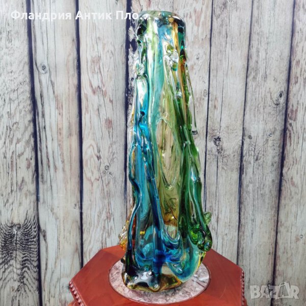Тази голяма, ръчно изработена стъклена ваза ще привлече всички погледи със своята красота и изящност. Вазата е изработена от висококачествено стъкло и е уникално произведение на стъклопластика.