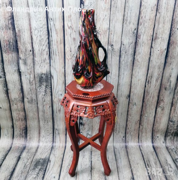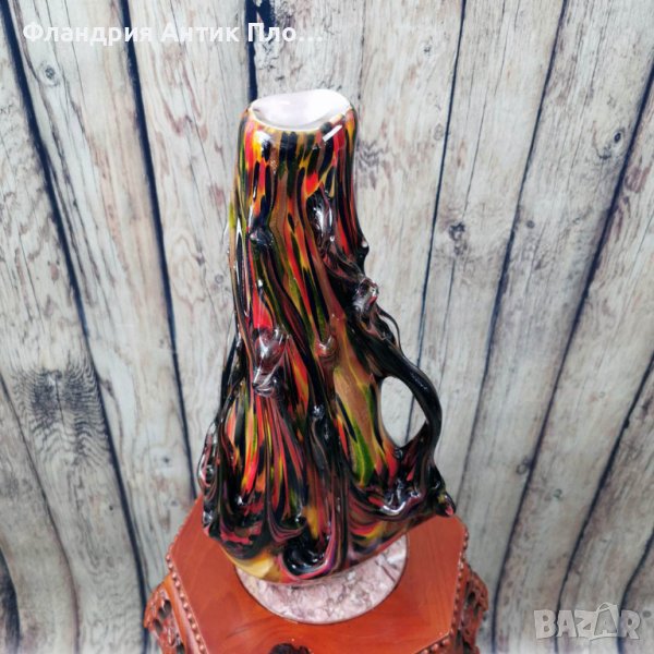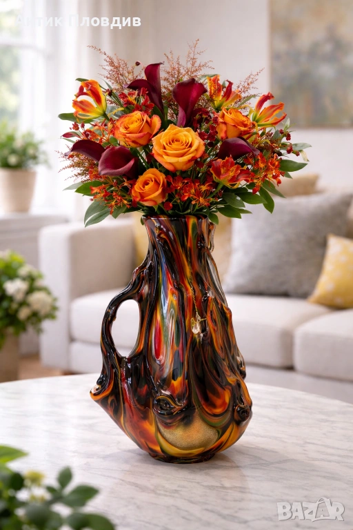 Нейната форма е елегантна и изваяна, с плавни линии и извити контури. Цветовата комбинация на червени цветове създава вълнуващи игри на светлина и отражения, които оживяват във всяка част от вазата.