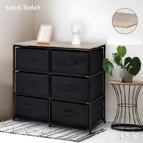 Скрин с метална рамка в черен цвят с 6 платнени чекмеджета с дръжка, От горната страна поставяте MDF повърхност в естествен цвят за по-голяма стабилност и издръжливост. Поставете го във всяко пространство, където искате да организирате малки предмети, дрехи и всичко друго, което трябва да бъде подредено.