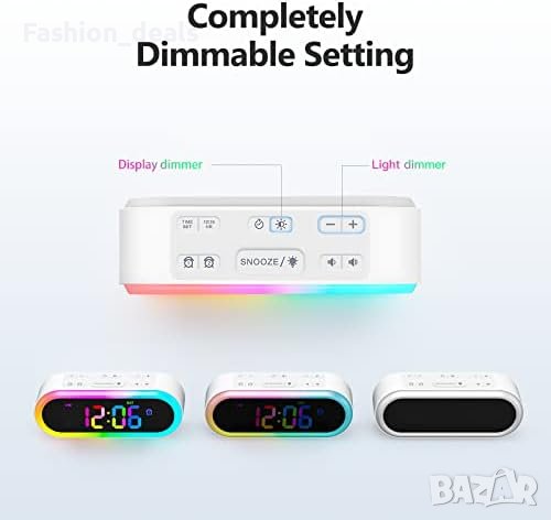 Часовникът разполага с нощни лампички Rainbow RGB, които могат да създадат перфектна атмосфера за всеки повод. Можете да персонализирате изживяването си с различни цветни светлини за обкръжение и да избирате от 20 нива на затъмняване. Има и допълнителна функция таймер, която ви позволява да настроите светлините да се изключват автоматично след определено време.
