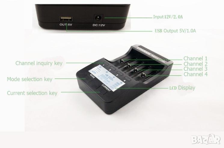 Изходящ ток за зареждане: DC 4.20V for Li-ion; 4.35 V DC за IMR; 3.65 V DC за LiFePO4; 1.48 V DC за NiMH/Ni - CD; 9.0 V DC за NiMH