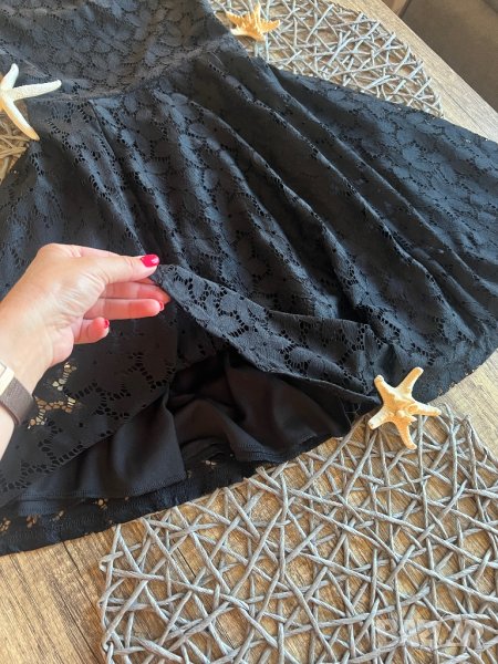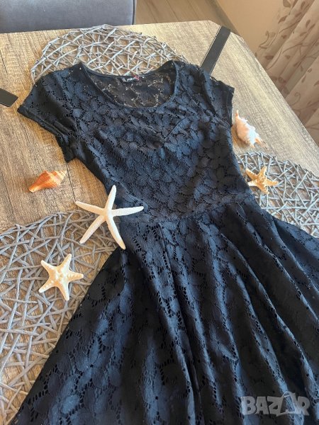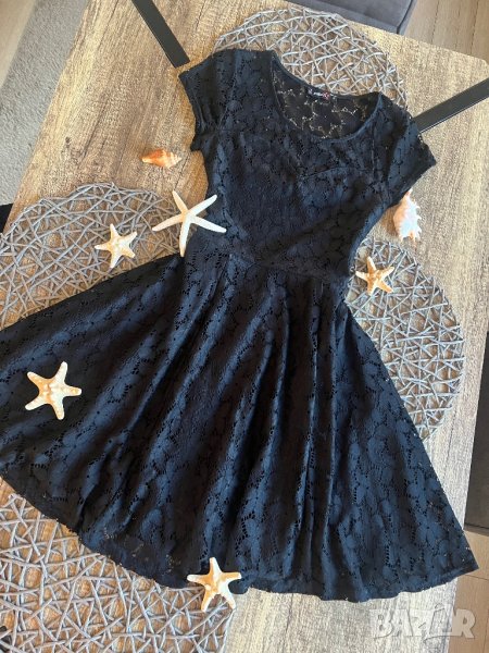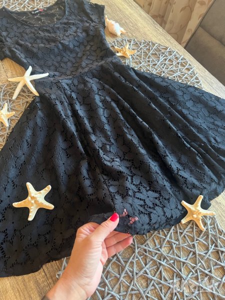 Изключително красива черна рокля. Цялата е от дантела, но е с подплата и не прозира. Разкроена доста. Размер по етикет S, но клони към XS. Няма средство за закопчаване.