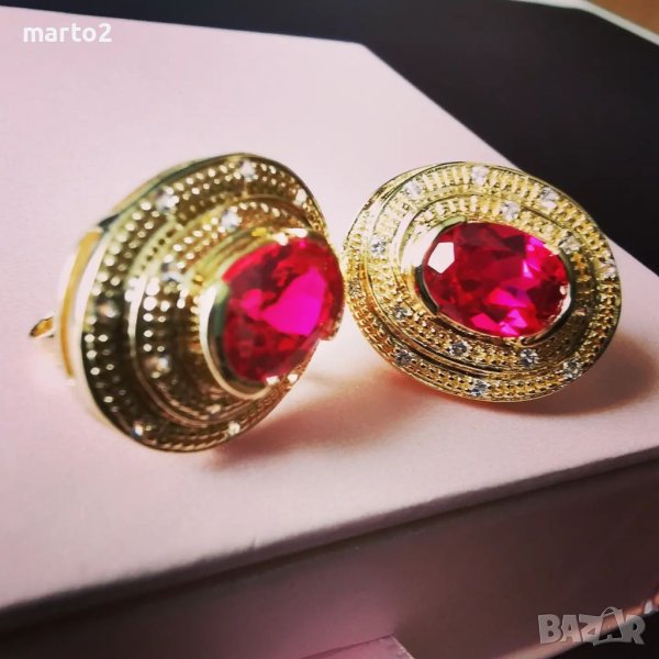 Елегантни Сребърни 925 Обеци с 14 карата позлата и Лабораторни Рубини и Циркони! → Обява 41291656