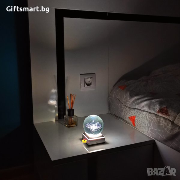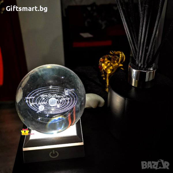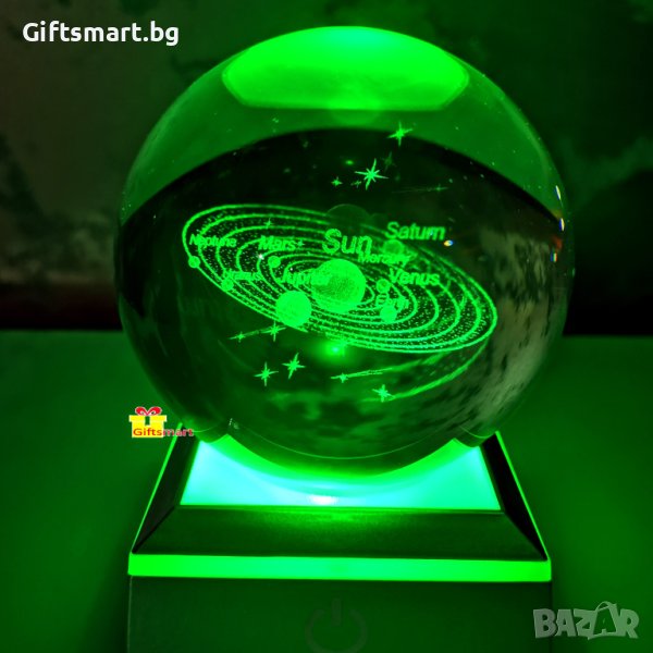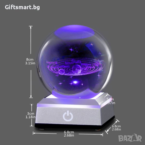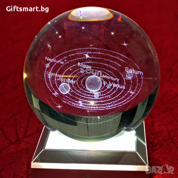 Разкрийте тайните на Слънчевата система и се потопете в невероятната красота на космоса с нашата 3D кристална топка на Слънчевата система. Тази кристална топка на Слънчевата система е перфектното допълнение към вашия домашен интериор или идеален подарък за всеки любител на космоса. Поставете я на вашия бюро, полица или витрина и нека привлича вниманието на всеки, който я види. Кристалната сфера е с диаметър 8см. Във вътрешността си има 3d изображение на слънчевата система , гравирано с лазер. Топката се поставя върху модерна основа със сменящи цвета си L.E.D. светлини. Тъч бутон за включване, изключване и смяна на цветовете. Топката свети с 3 батерии ААА или usb кабел. ->Доставка с еконт и спиди. ->Опция тест и преглед.