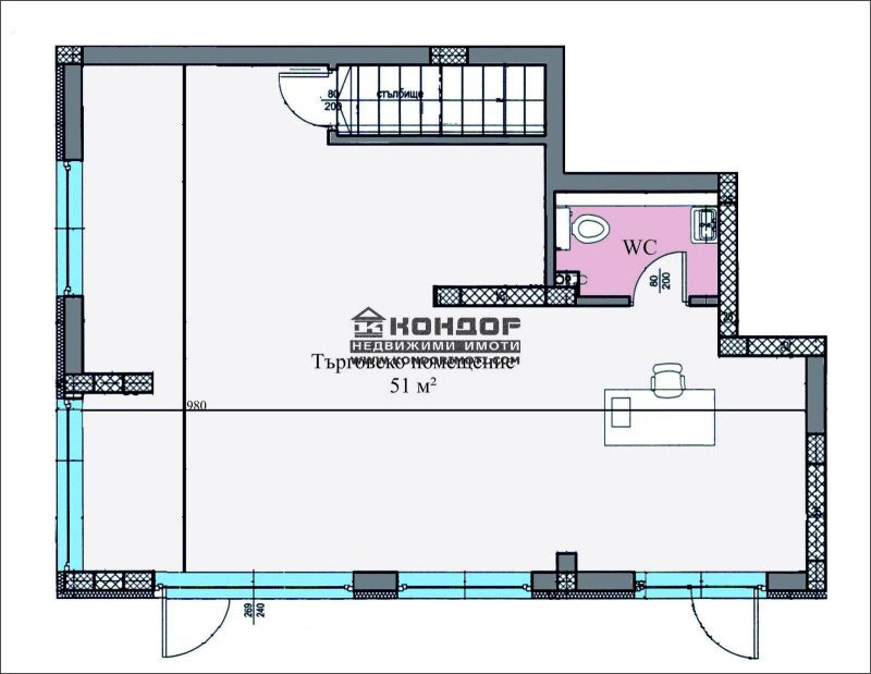 Оферта 60564: Предлагаме на Вашето внимание магазин в малка пет етажна бутикова сграда с осем апартамента, разположена в района между Новотела и Моста на Герджика с готов наемател. Магазина е на две нива и се състои от едно голямо търговско помещение -51кв.м на първо ниво и санитарен възел. В сутерена е складовото помещение -89кв.м. Магазина е с огромна стъклена витрина, има лице на две улици, поставени са подови настилки и окачен таван. Перфектното местоположение характеризира района като един от най-предпочитаните за покупка на основни жилища. Кондор имоти предлага възможност за банково финансиране от водещи банки на преференциални условия.