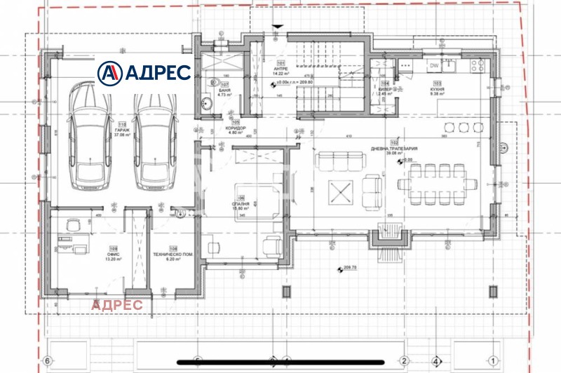 Къщата разполага с дневен тракт 50 кв.м., 4 спални едната от които е със собствена баня и гардеробна, 3 бани с WC, перално помещение, офис помещение, техническо помещение и двоен гараж. Към дневната и кухненската част има прилежащ килер за посуда и продукти. Всички стаи имат излаз на тераса. Прекрасна веранда с изглед към двора с обособени места за трапезарна маса и кът с мека мебел.