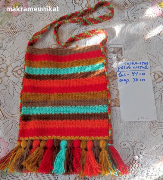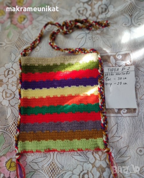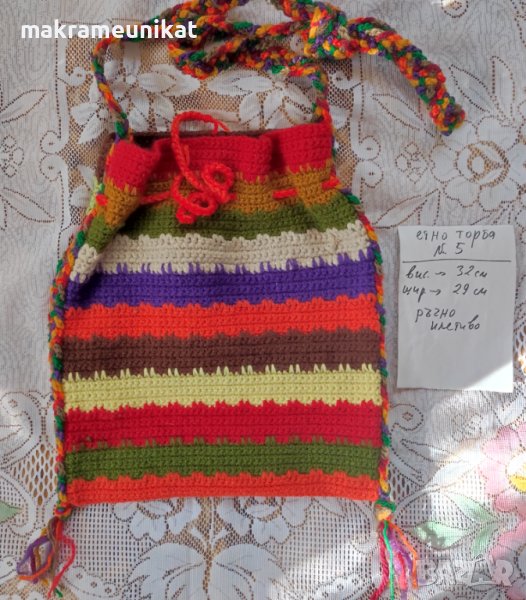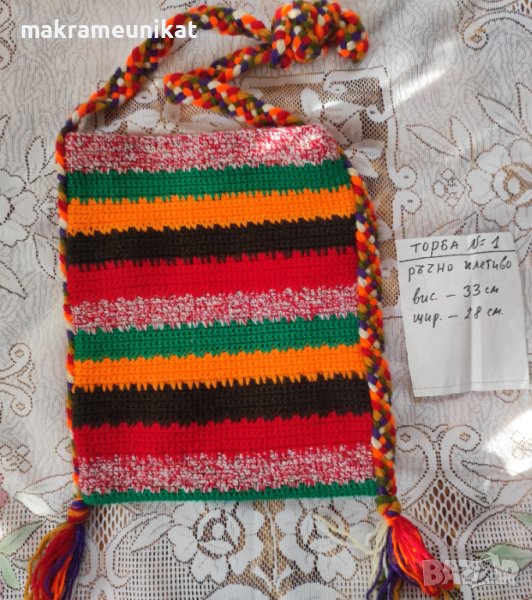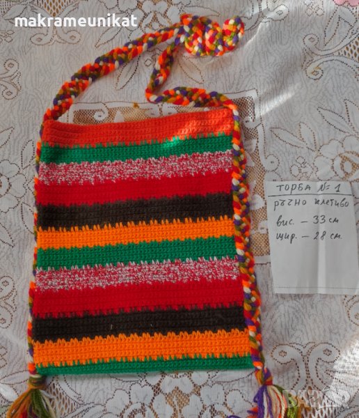 Продавам торби за народна носия, ръчно плетиво от прежда акрил, шарени и пъстроцветни. Няколко различни са, вижте в снимките.