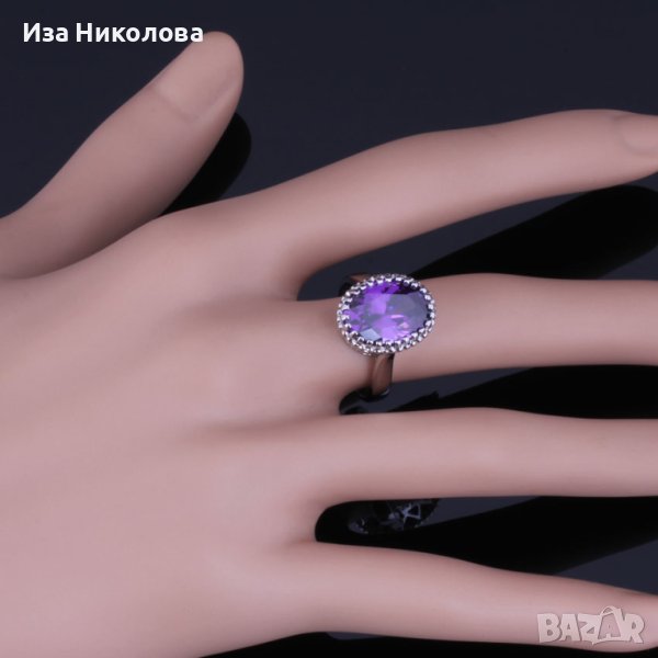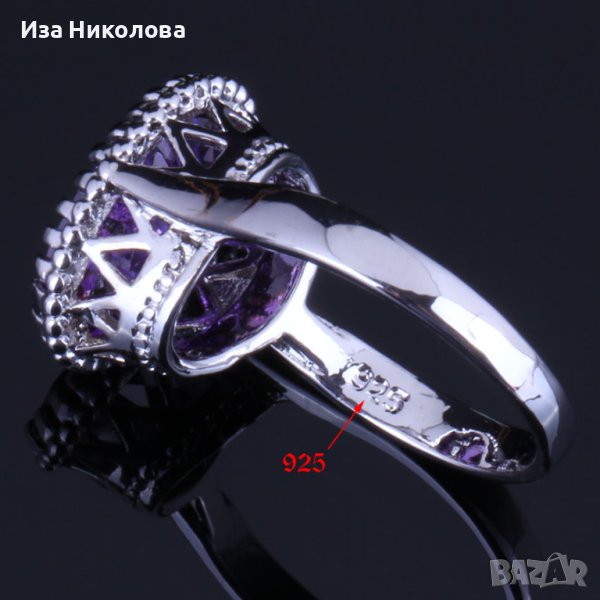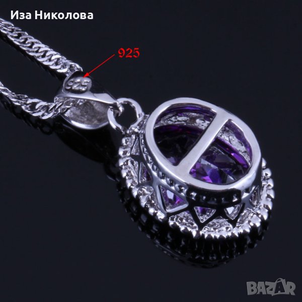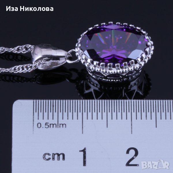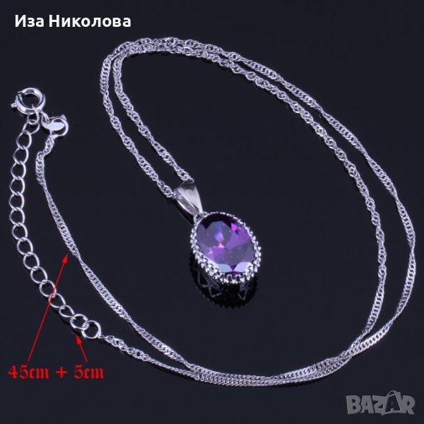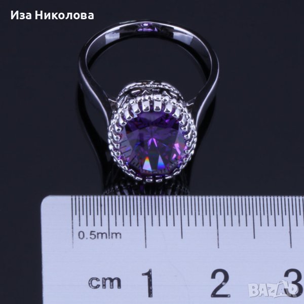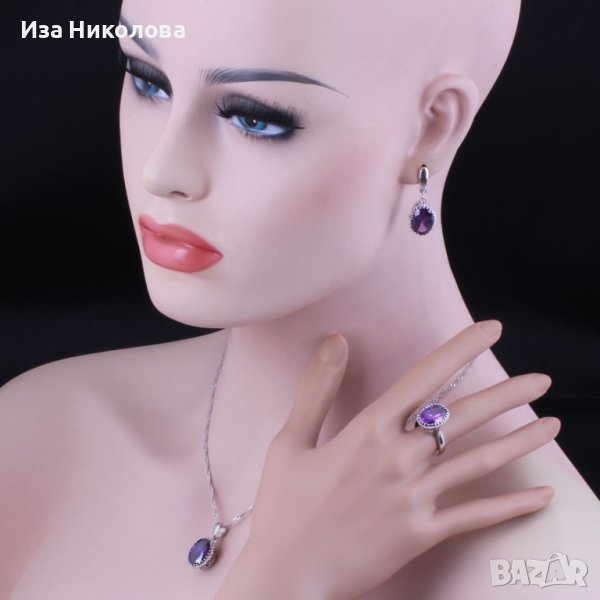 Сребърен комплект състоящ се от пръстен с размер 10, колие и обици с лилави сапфири.
