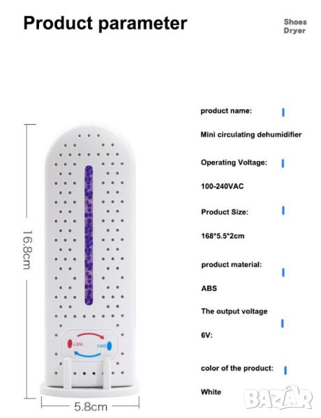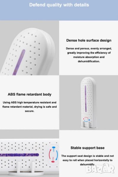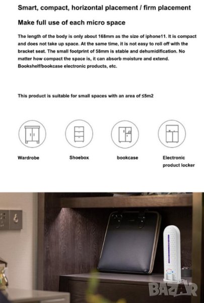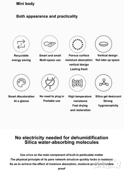 Стандартните влагоуловители изискват сменяеми абсорбиращи касети, които остаряват и трябва да се изхвърлят. Предложеният уред е различен и много по-екологичен. Устройството е оборудвано с PTC система, състояща се от 3 керамични елемента, които равномерно загряват и изсушават влагопоглъщащите частици, за да могат да бъдат готови за употреба отново след известно време. Те също са нетоксични и ефективни, като абсорбират до 150 ml вода наведнъж. Грижите се както за вашето здраве, така и за околната среда!