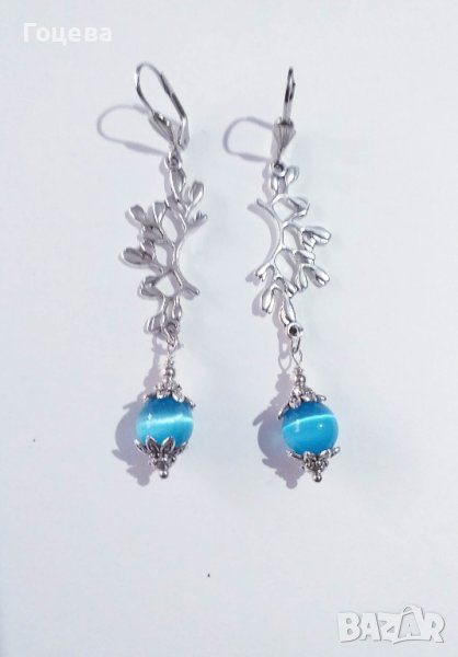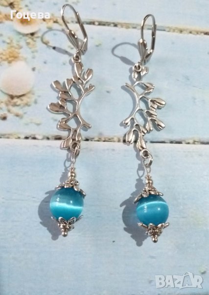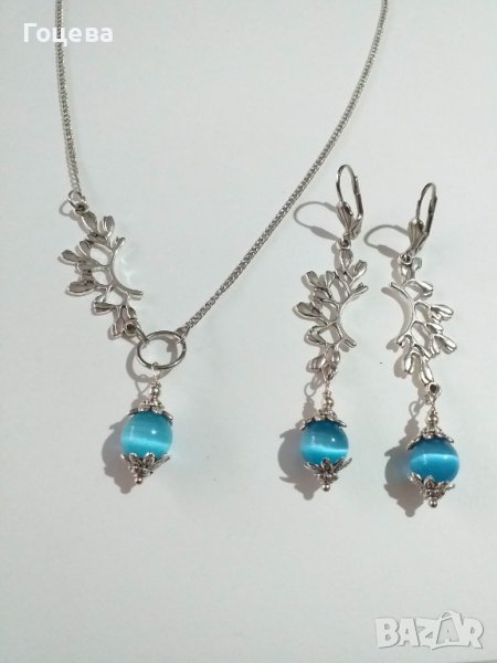 Прекрасният ни нов комплект бижута с лазурно сини камъни Котешко око и фини орнаменти в цвят сребро