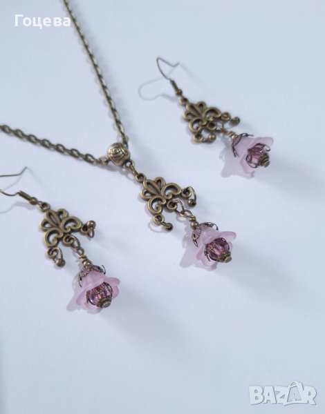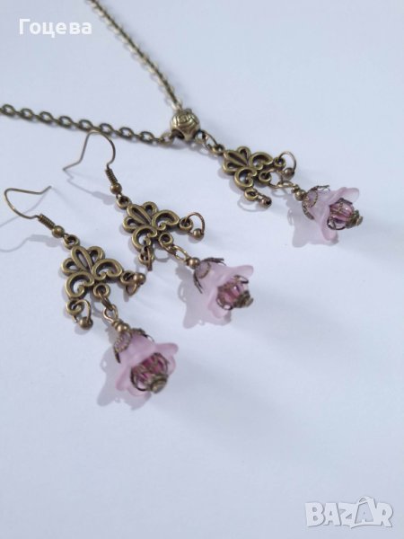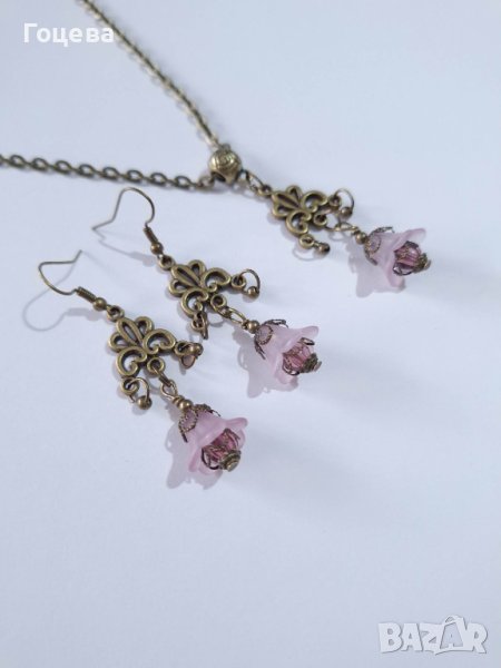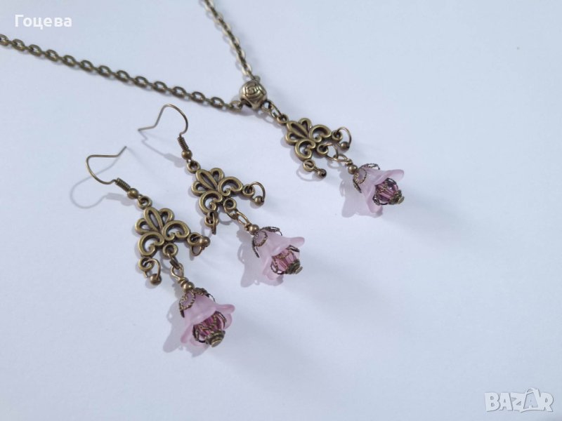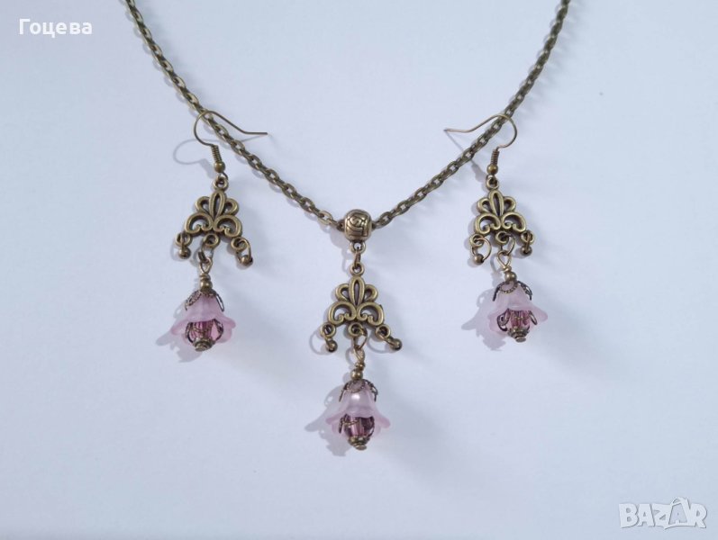 Нежен комплект бижута обеци и колие с нежни розови цветя и разкошни бронзови орнаменти → Обява 41312320