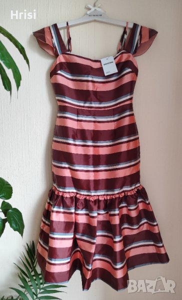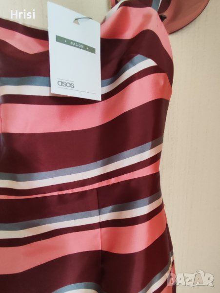 Страхотна нова рокля ASOS с етикет. Размер UK 10, отговаря на М. Материята има лек блясък. Моделът е комфортен и забелязващ се, в комбинация от бордо, прасковено и светъл графит.