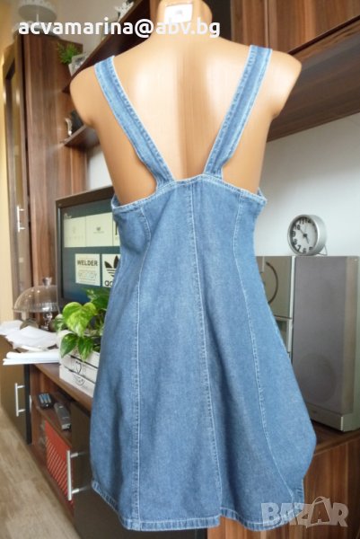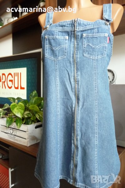 Много кокетна и удобна дънкова рокличка от тънък деним.Подходяща за ежедневие , за плаж, тъй като се облича лесно . Отлично състояние , без забележки .Ще дам точни размери : Презрамките може да се регулират , затова давам дължина на на ципа отпред-63 см , ширина от мищница до мищница едностранно 40 см , Талия и ханш не давам , защото роклята е с А-образен силует .