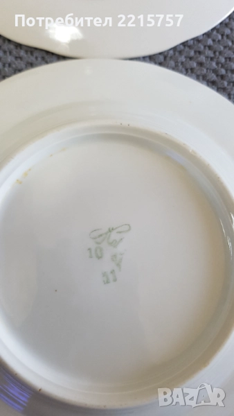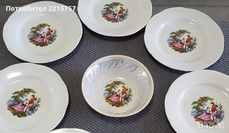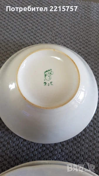 1)Френски десертни чинийки. Ф 19,5см. Закупени в Италия. Общо 7бр. Цена 42лв...................................................................................................................2)Илюстрирани десертни чинийки от миналият век. 6бр. Ф17,5см (1980-1991)Полонски.+една дълбока купичка (1974-1984г.Бориславски) Имат маркировки. Цена за к-т 75лв..................................................................................................................3)К-т нов за торта. Има кутия. Става и за подарък. Ф29см+лопатка. Цена 10лв...................................................................................................................4)Стар съд за бисквити или бонбони. Вис. 13,5см, Ф12,5см. От Германия. Цена 15лв.