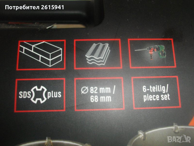 ОПИСАНИЕ на нов комплект боркорони - цена 99 лв. Марка и модел - Parkside PBKS 6 A1. Made in Germany 01/2023 г. Bohrkrone-Set, Core Drill Bit Set. Подходящи за камък, тухла и лек бетон. От висококачествена карбонова стомана. 2 боркорони /68 мм и 82 мм/, 2 центриращи свредла и 2 адаптера.
