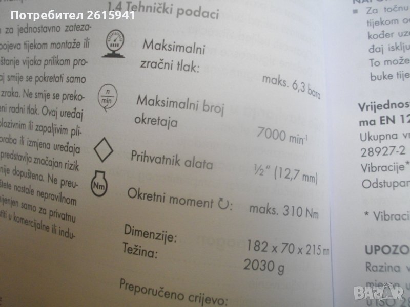 - Номинално налягане на въздуха: макс. 6,3 бара