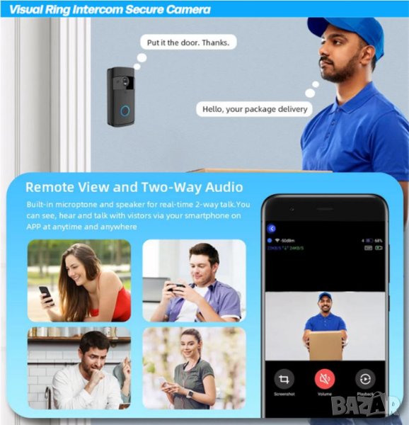 Висококачествен двупосочен разговор, с премахване на шума PIR откриване на движение, когато има някой вратата, веднага сигнализира към мобилният смартфон.