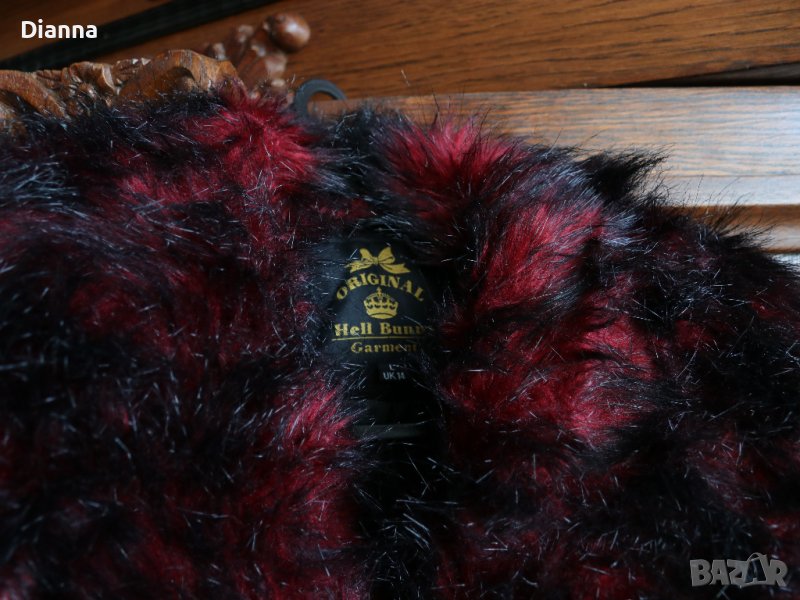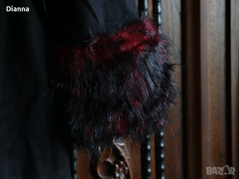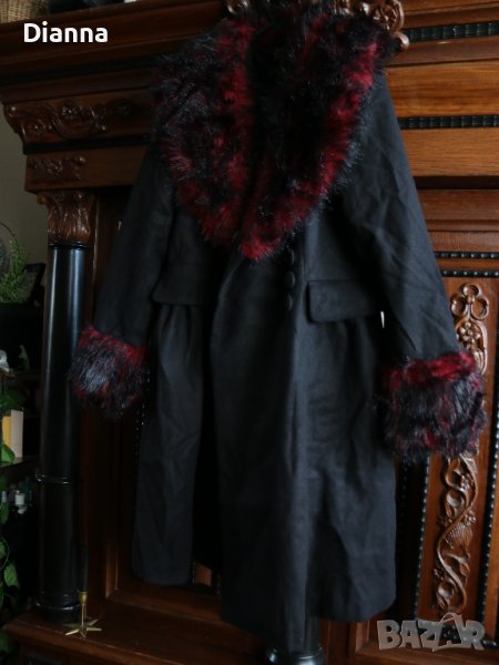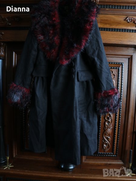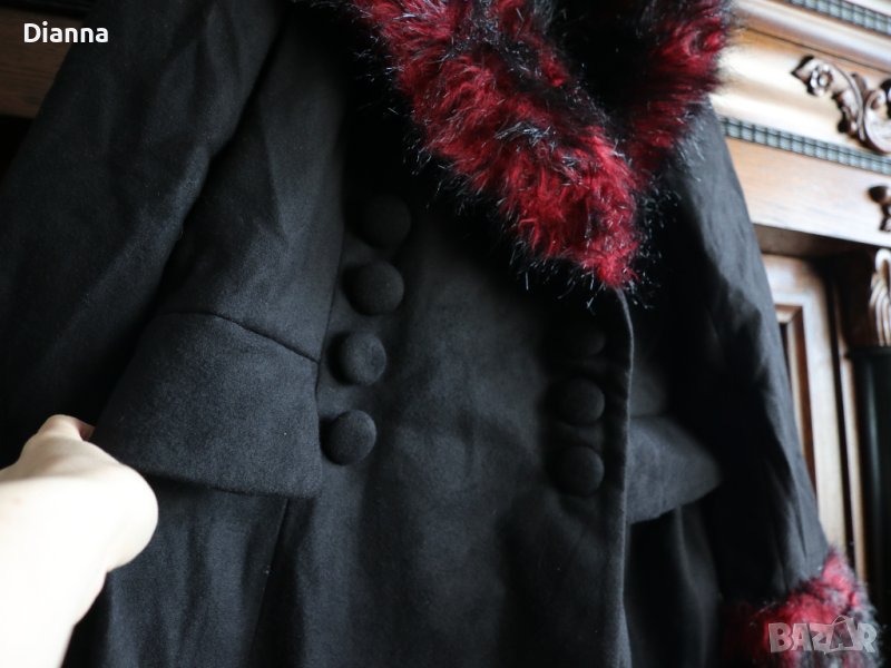 Уникално дамско палто в черен цвят, с червеникава яка от изкуствен косъм на известната готик/алтернативна британска марка Hell Bunny.