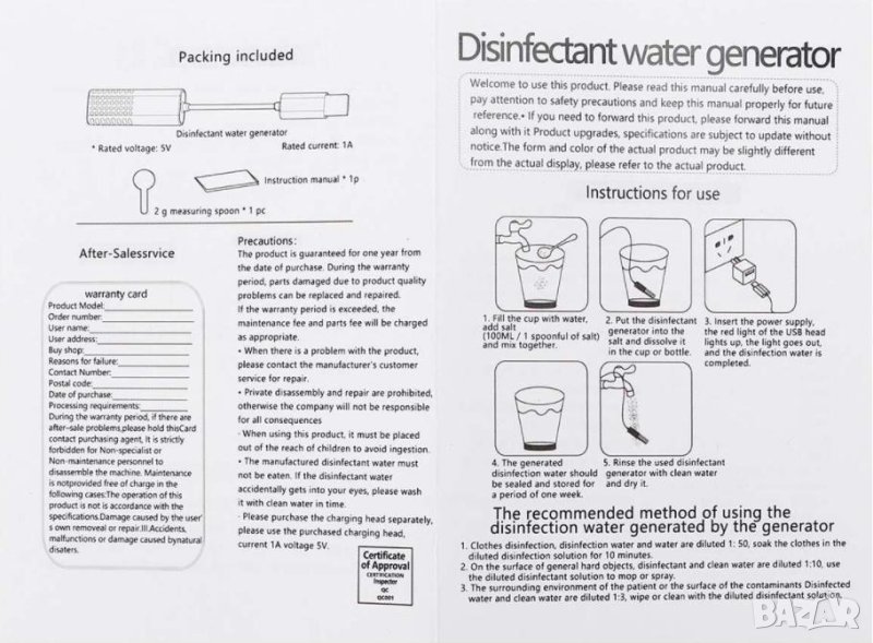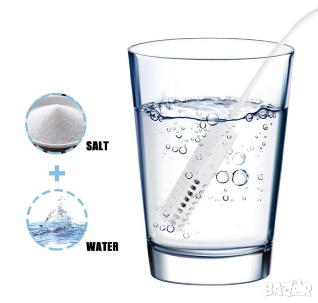 Просто поставете уреда в чаша или кана и добавете чешмяна вода + обикновена сол, за да се получи (генерира) течността за почистване натриев хипохлорит (хипохлорна киселина), която може бързо и ефективно да неутрализира бацилите.