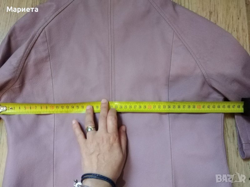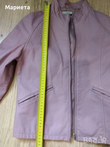 Якето е естествена кожа в много приятен пастелно пепеляво розов цвят. Без забележки.