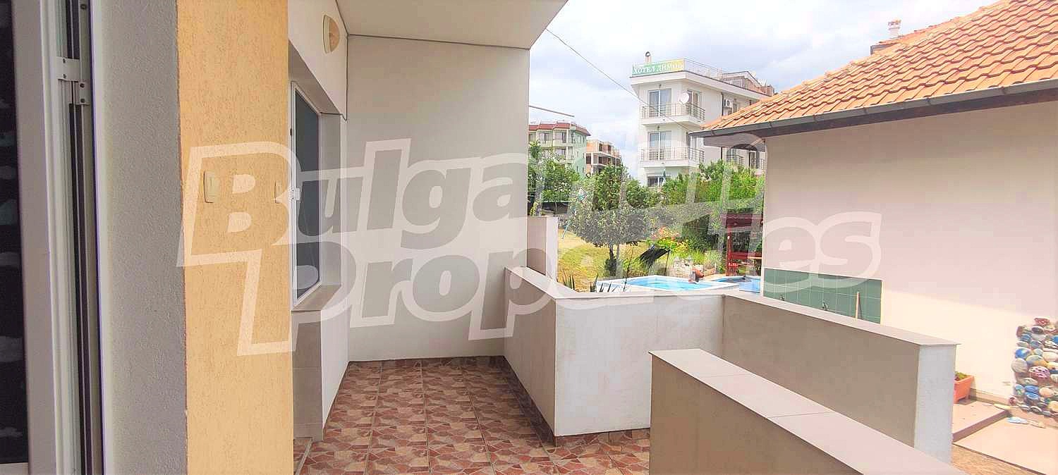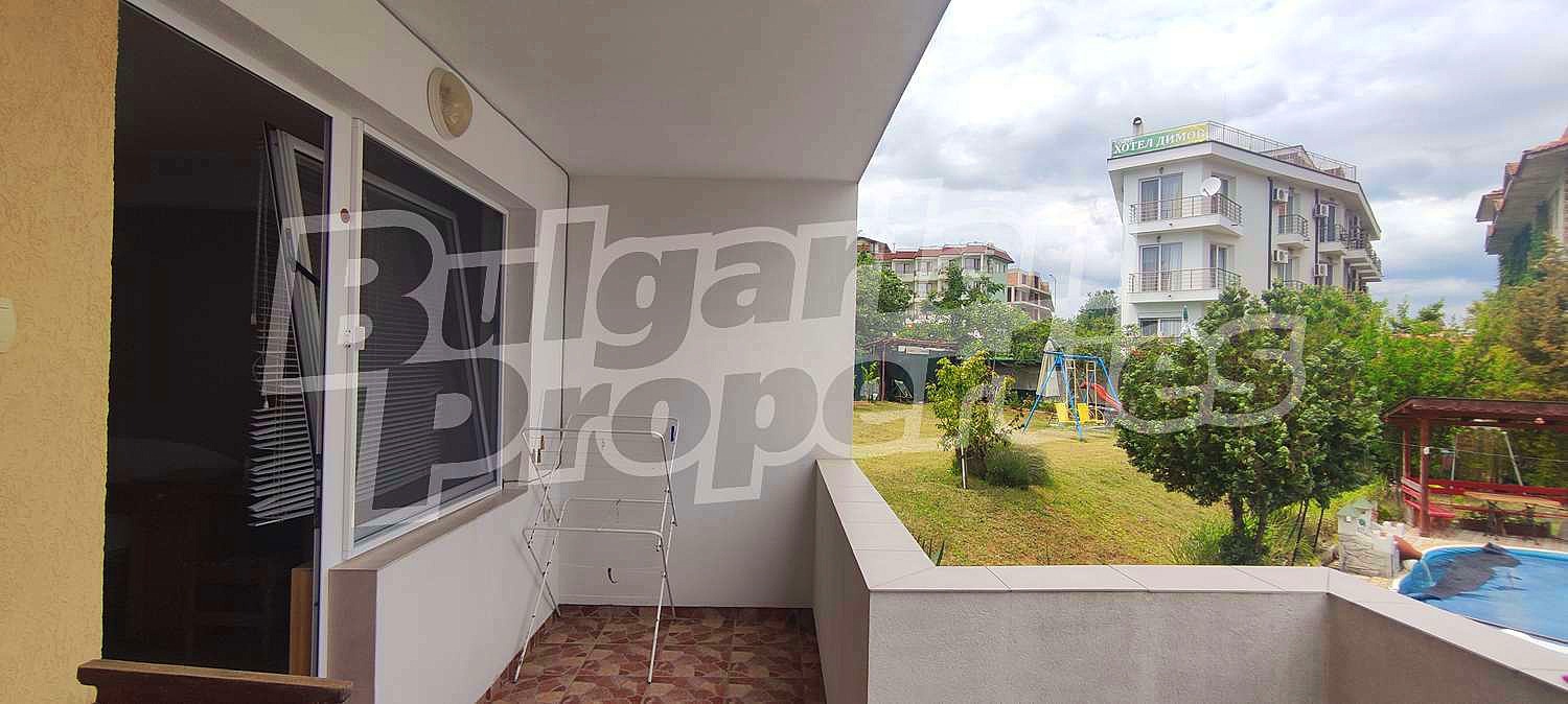 Продават се двете сгради (504.36 кв.м.) с апартаменти: тип студия и двустайни жилища, с обособена кухненска част, самостоятелни санитарни възли и тераси тип лоджия. Всички са обзаведени и оборудвани за отдаване под наем. За отопление и охлаждане са монтирани климатици. Има и панорамна покривна тераса над първата сграда, подходяща за общо ползване.