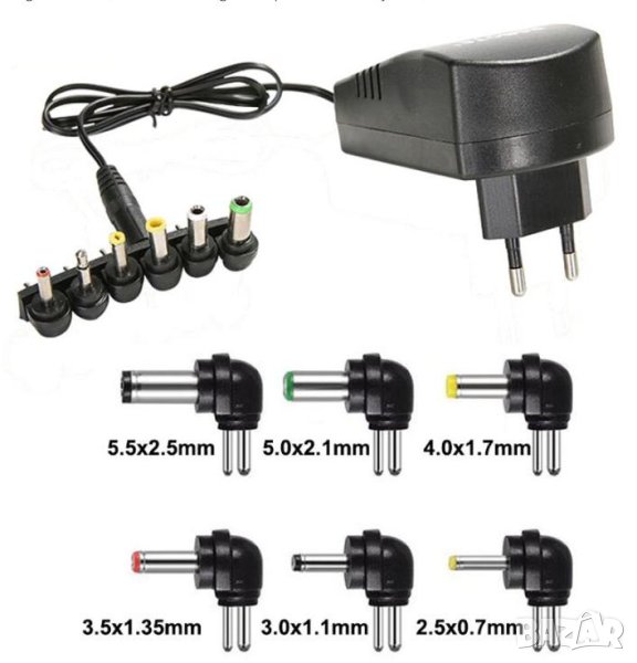 В комплекта са включени 7 броя накрайници: 2.5x2.1мм, 3.5x2.1мм, 5.0x2.1мм, 5.5x2.5мм, 3.5x1.35мм, 5.5x1.5мм, +*