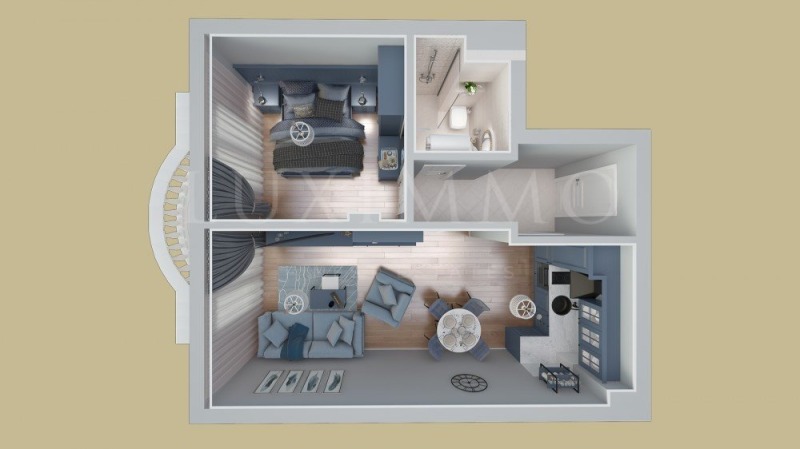 Имотът се намира на 3-ти етаж и има западно изложение. Състои се от коридор, спалня, дневна/кухня и тераса.