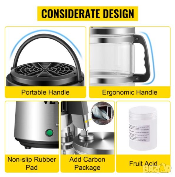 Удобни за потребителя детайли: Модернизираният VEVOR™ дестилатор за вода има уникална преносима дръжка в горната част, лесна за носене. Контейнерът за вода е с голям отвор и ергономична дръжка за лесен достъп и почистване.