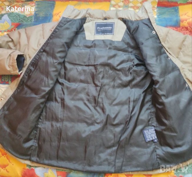 яке с пух, подходящо за спорт, и джобове. По ръбовете има следи от протривания.