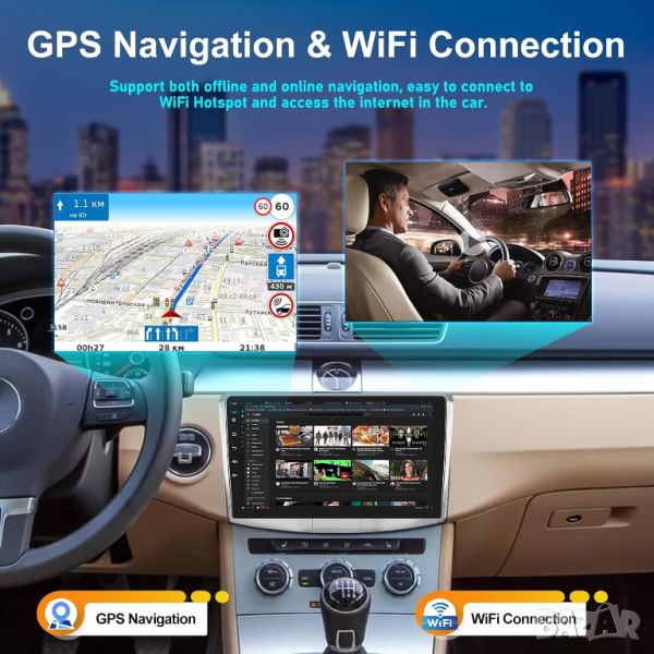 Wi-Fi интернет, новият Андроид, Bluetooth за разговори и музика, USB входове за флашка и зареждане на устройства, GPS навигация, теми за вид на меню, еквалайзер за настройка на звука, бърза реална RAM памет от ново поколение. ТОП дизайн!