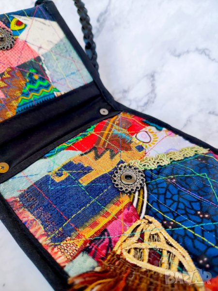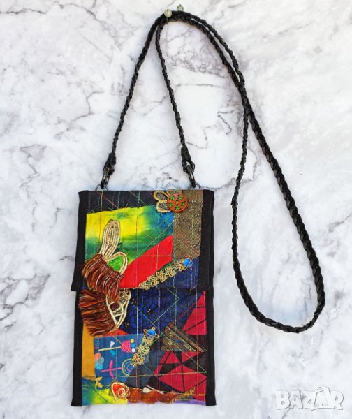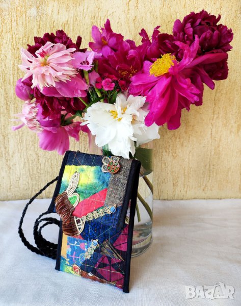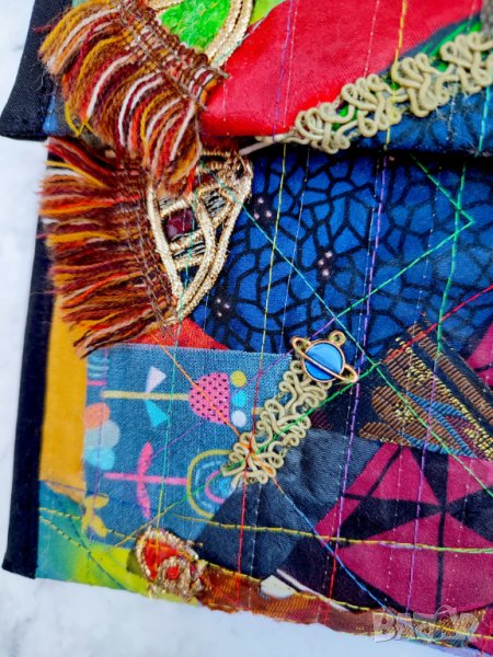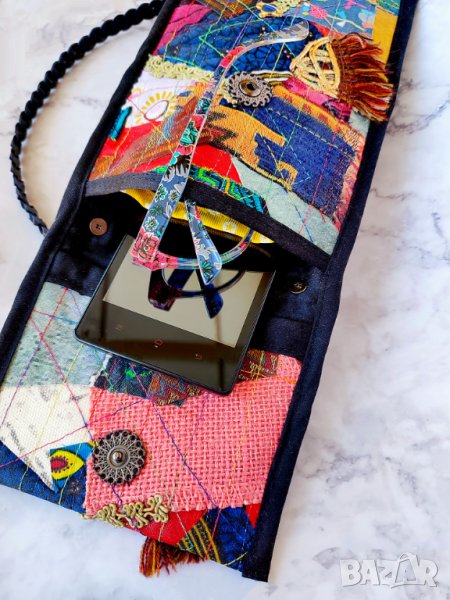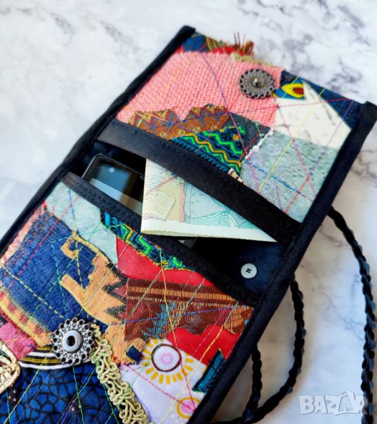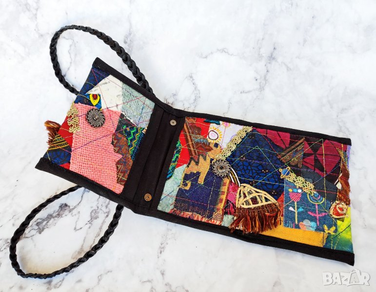 малки портфейли, карти, пари в брой, очила, ключове и др. За колажа съм използвала скрап и нови парчета плат, панделки, дървени копчета, метални талисмани и различни цветни конци.
