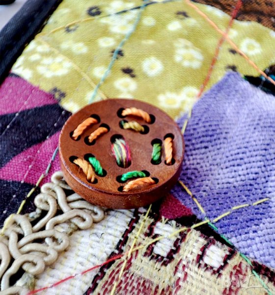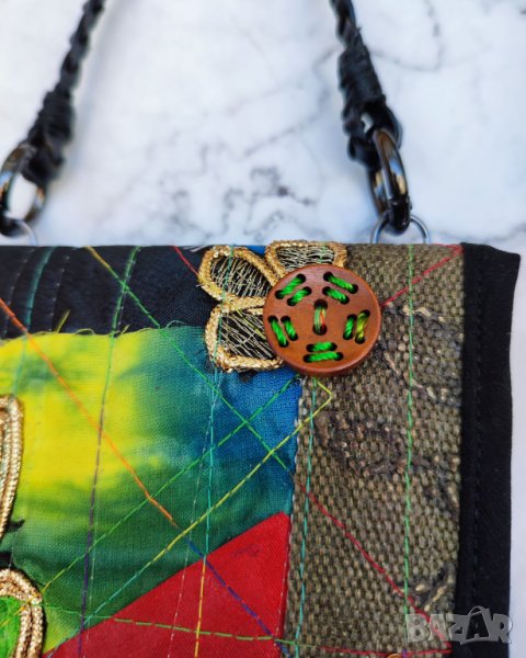 (9,5x14 см) за кредитни карти/банкноти. Капакът се затваря с пришито копче с формата на цвете. Каишката