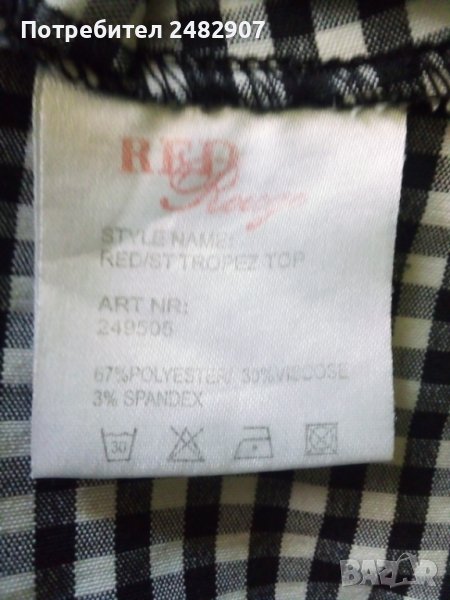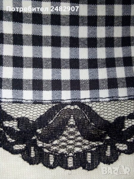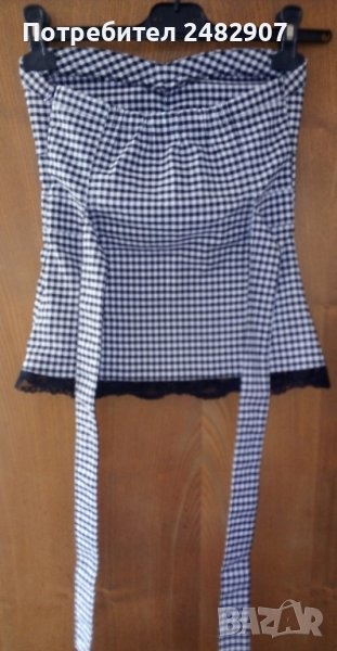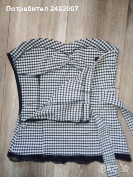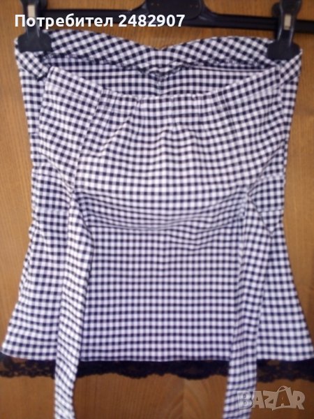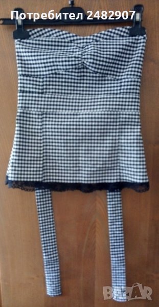 Дамски топ/бюстие в черно и бяло, размер XS, с връзки отзад и красива черна дантела в долната част. Съдържа 67 % полиестер, 30 % вискоза и 3 % спандекс. Закопчаване - с частичен скрит цип отстрани в ляво. Ширина под мишниците - 33 см, ширина в долната част - 42 см, дължина от под мишниците до долу - 38 см. Много запазено, почти не е използвано, леко еластично, много елегантно, вталено, без забележки.