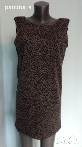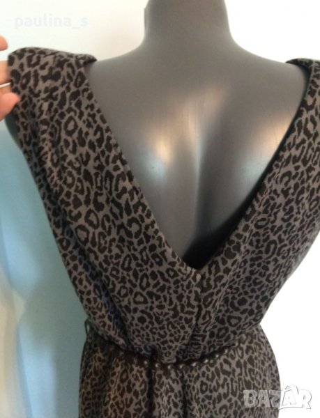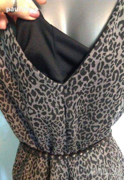 1. Колаж / L / 2XL - "Ichi". Цената е крайна 24,99лв. Уникална рокля с отворен гръб в леопардов принт в сиво. Горната част е подплатена, рамената са акцентира и с подложки, доста еластична и покрива няколко размера. Една бройка, нова без етикет. Брандът е за овърсайз дрехи, за това според техните мерки е S.