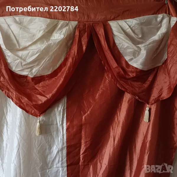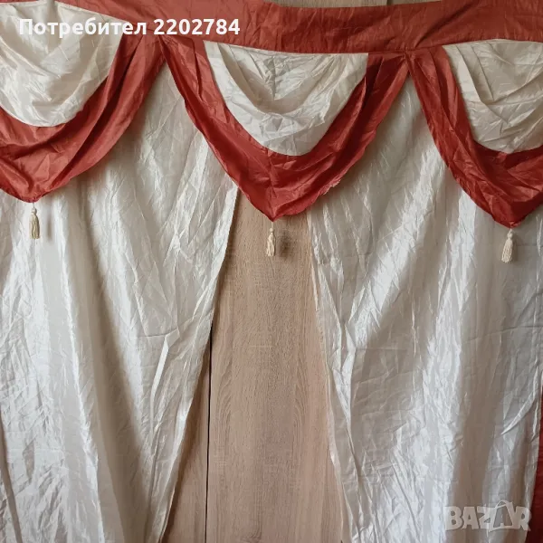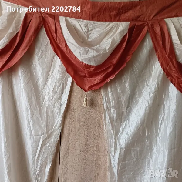 Второто перде е със страхотни драперии в горната част.Редуване на цвят керемидено и шампанско.Пердето е от плътна органза и при закачане разстоянието между двете бежови пердета в средата е 7см и затова няма нужда от допълнително перде отдолу.Без всякакви забележки.