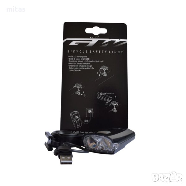 Предна светлина за велосипед XC-122W в бял вариант е с отличен дизайн и вградена акумулаторна батериия. Зарежда се с USB кабел. Фарът е с два мощни диода с голяма площ на обектива отпред. Икономически много изгодно, защото консумацията е много ниска и не е нужно да купувате батерии (те се зареждат). За зареждане на вградената батерия можете да използвате USB изхода на компютъра или зарядно за смартфон, което има стандартен USB изход на адаптера.