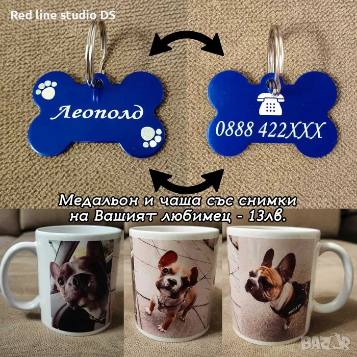 Може да си поръчате и комплект медальон и порцеланова чаша с до три снимки на Вашият любимец на цена от 6.65 евро. Чашите са 0,330мл. за чай или кафе и можете да ги видите на снимка 6. Снимките може да ни изпратите тук или на Вайбър на посочения телефон.