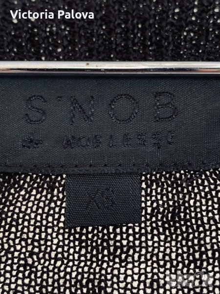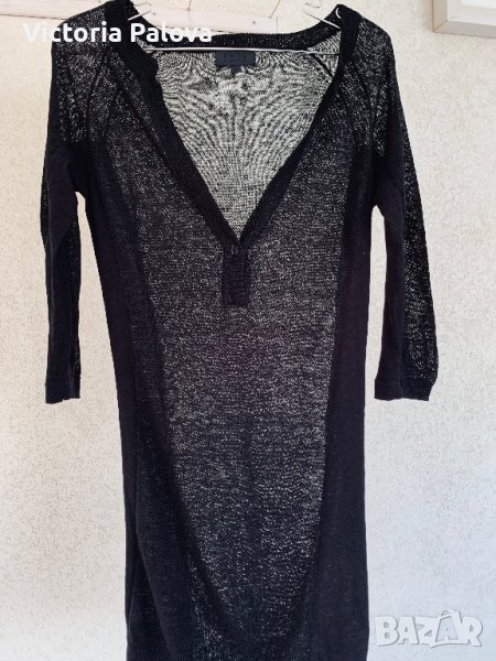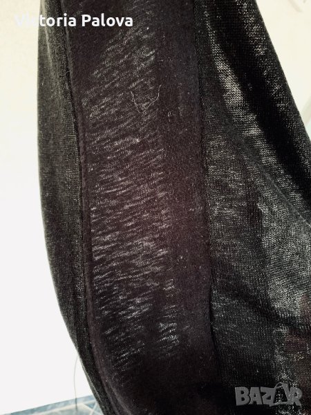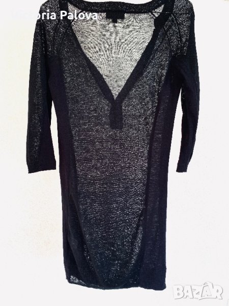 Дълга блуза от плетен лен с памучни вставки отстрани и по ръкави,подходяща за море -вечер или за плаж- прозрачна е.Много различна дреха, наситено черна, с блясък, интересна “якичка” и деколте, маркирани копчета ( скъпа марка S’NOB DE NOBLESSE ). Блузата е направена с внимание към детайлите, разтеглива. ГО- 45 см, дължина -83см, реглан.