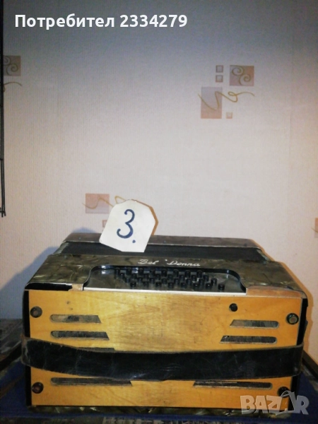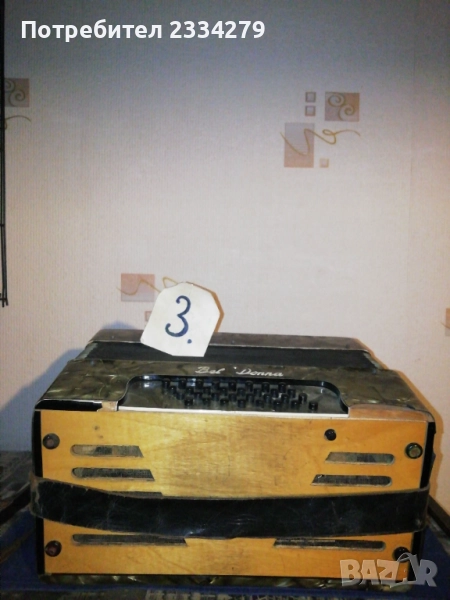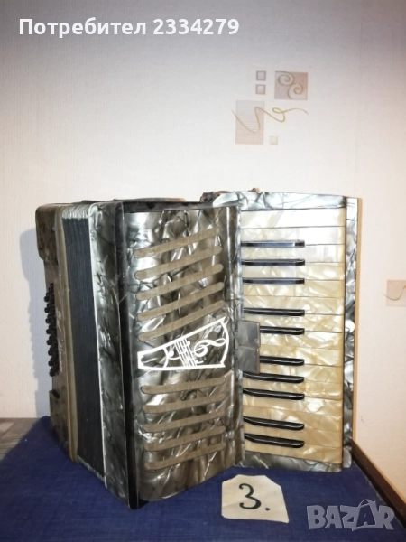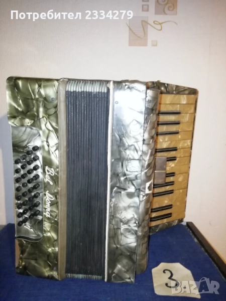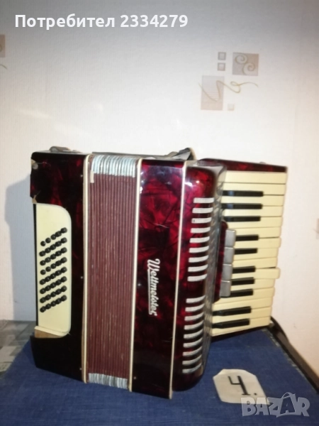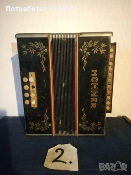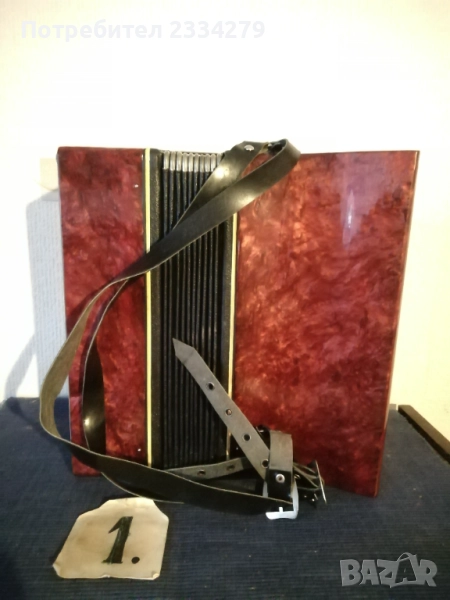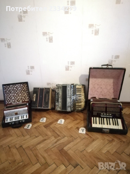 N:1 децки акордеон ,,Мальlш" перфектно състояние, куфарът мирише на ново, неизползвано,цена 35€; N2 немски акордеон-хармоника ,,HOFNER" 1920-30год., свири но не зная дали е изправна и може ли да се ползва, но е подходяща за декорация на арт ретро заведение, пиано бар, витрина и други, цена 35€.; N:4 cтар немски акордеон,,Weltmaster" 40 баса. Всичко е налично по него има звуци но е нужна профилактика,настройка. Има и куфар няма липсващи предмети, цена като за неработещ 25€. комплект с куфара; N:3 ,,Bella Donna" 42баса,италиански, свири без липси цена 40€. Може да се ползва и като декорация за битово заведение,чайна,пиано бар и други идеи.