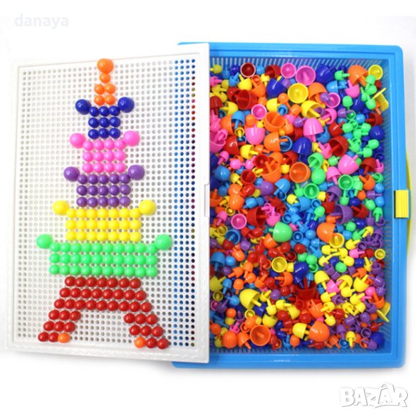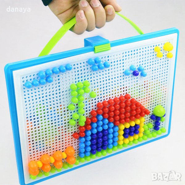 Образователна мозайка за детска игра с 296 части. Играта с мозайка с гъбки се състои в закачане на гъбките в дъска за създаване на картини. Комплектът ще достави страхотно забавление на вашето дете, докато създава разнообразни картини, създадени само от въображението му. Пъзелът съдържа различни видове гъбки, има 3 размера за избор в различни цветове. Куфарът е снабден с дръжка. Пъзелът развива креативността и стимулира въображението. Можете да подреждате различни картинки и да смесвате размерите на гъбите. Играчката ще бъде идеална за изучаване на цветове, също така учи на броене (изваждане и събиране).