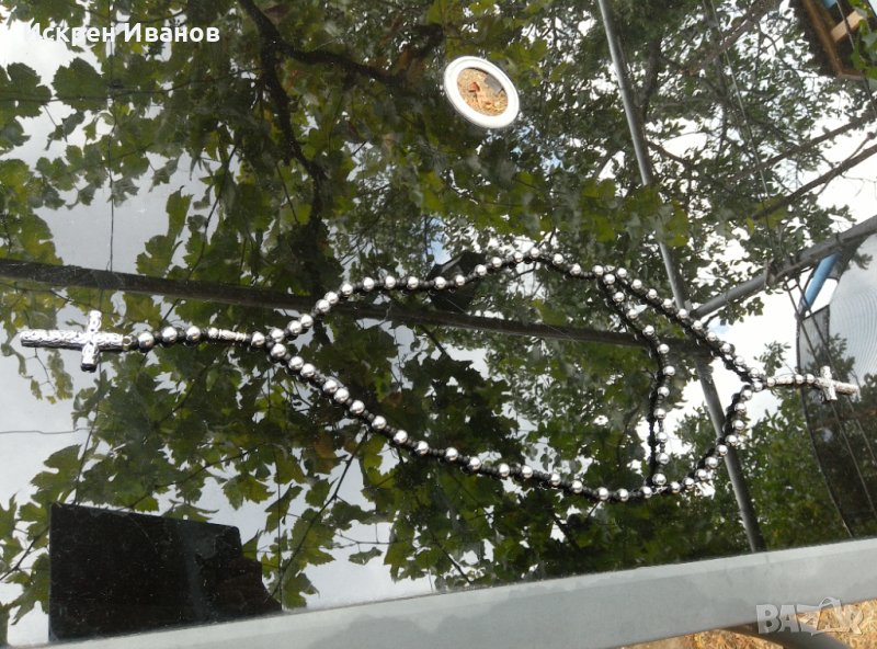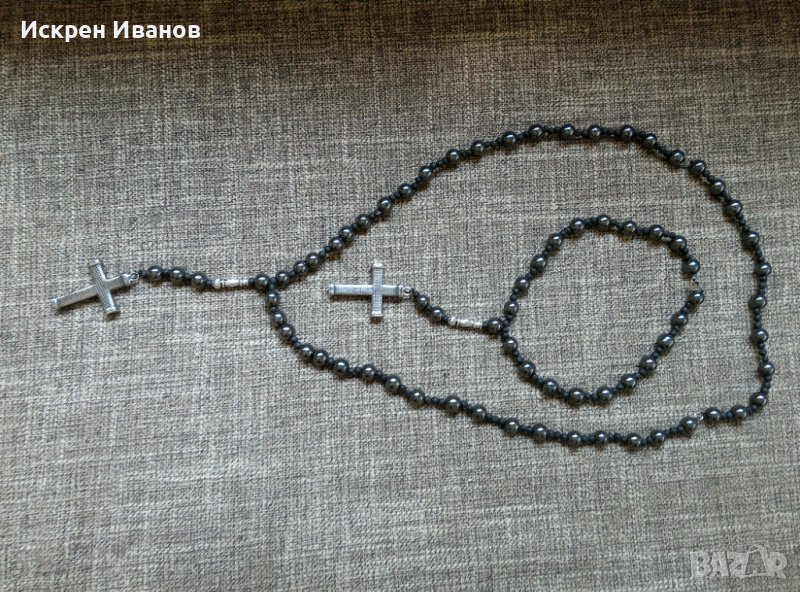 Ръчно изработено двойно разпятие от хематит 10мм и вулканичен камък 4 мм. Възможност за избор на клиента на вида на минерала. Късата част е предвидена да може да се носи и на китката като отделна част/виж на снимка/.